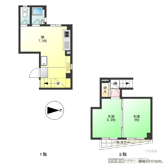 駅まで徒歩2分で、南向きで日当たり良好、室内洗濯機ありのメゾネットタイプの物件です。